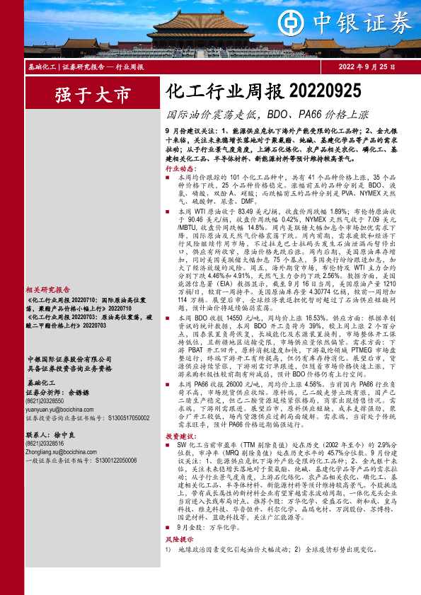 【中银证券】【20220925】20220925-中银证券-化工行业周报:国际油价震荡走低,BDO、PA66价格上涨-13页