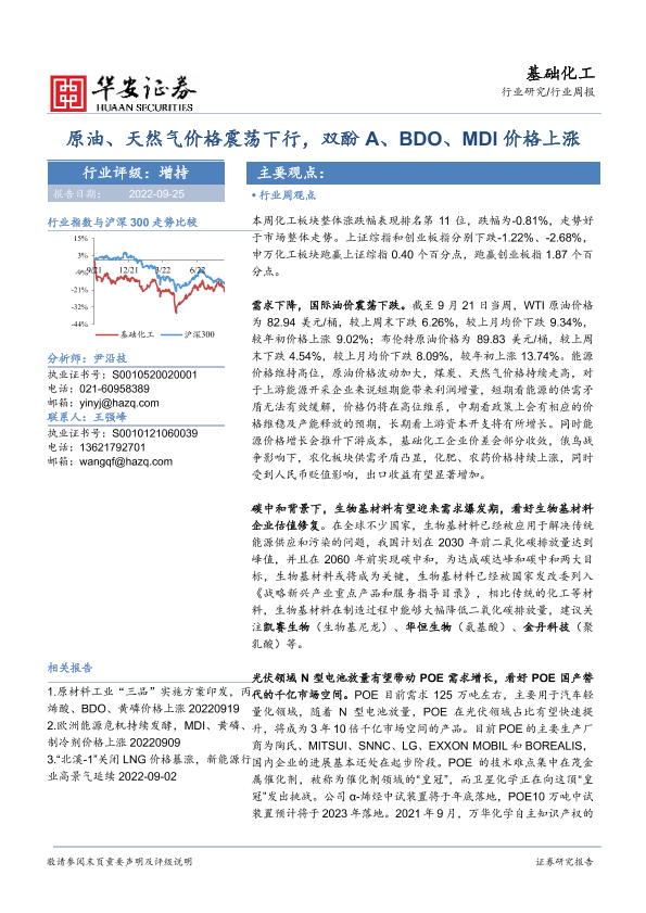 【华安证券】【20220925】20220925-华安证券-基础化工行业周报:原油、天然气价格震荡下行,双酚A、BDO、MDI价格上涨-45页
