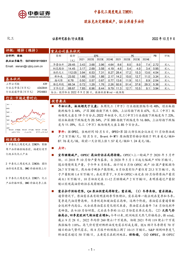 【中泰证券】【20221009】中泰化工周度观点22W39:欧派克决定继续减产,Q4去库看多油价-29页