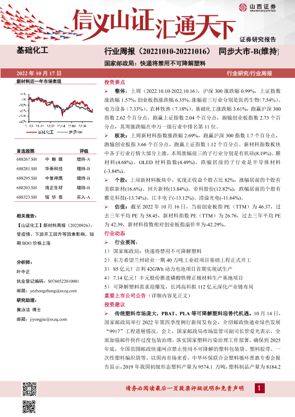 【山西证券】【20221017】20221017-山西证券-基础化工行业周报:国家邮政局:快递将禁用不可降解塑料-18页