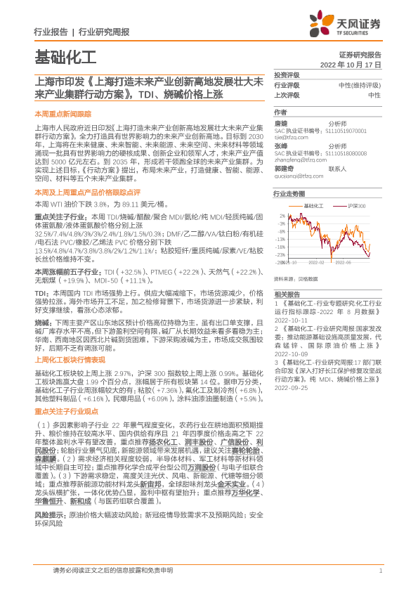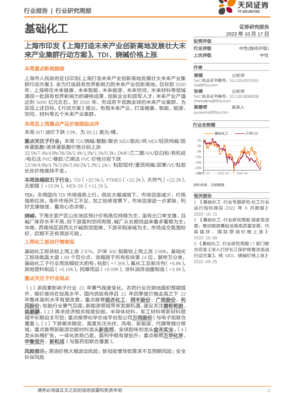 【天风证券】【20221017】基础化工行业研究周报:上海市印发《上海打造未来产业创新高地发展壮大未来产业集群行动方案》,TDI、烧碱价格上涨-20页