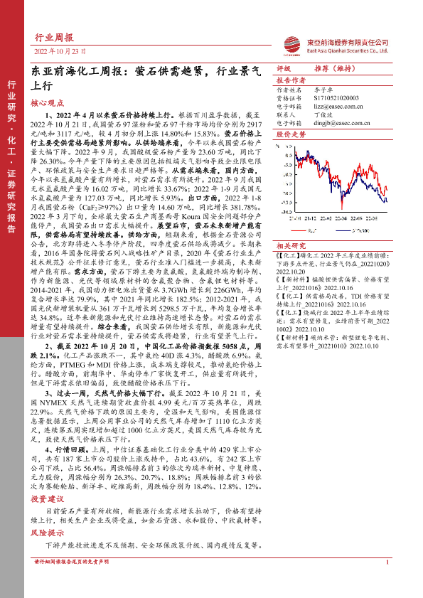 【东亚前海证券】【20221023】东亚前海化工周报:萤石供需趋紧,行业景气上行-22页