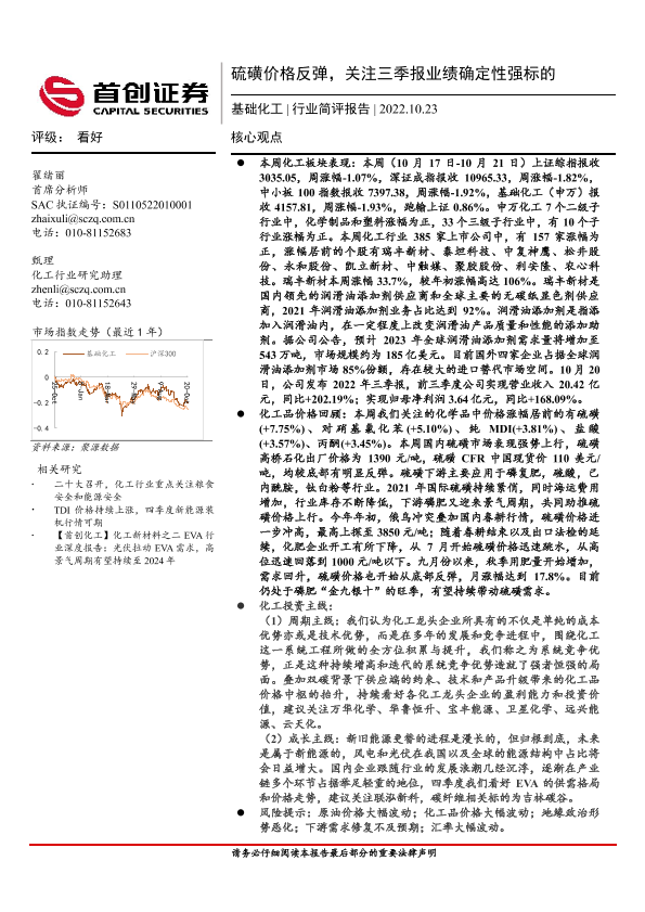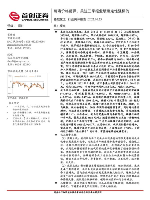 【首创证券】【20221023】20221023-首创证券-基础化工行业简评报告:硫磺价格反弹,关注三季报业绩确定性强标的-17页