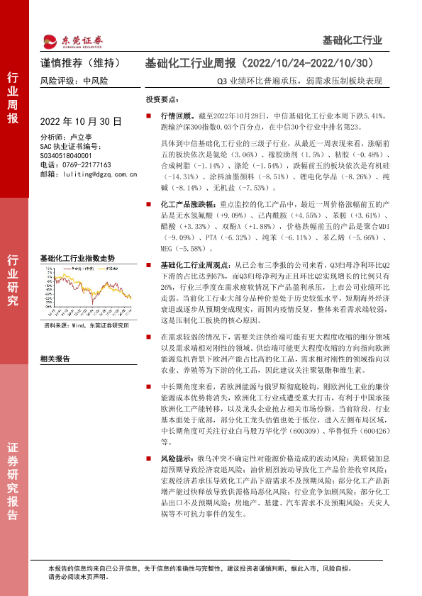 【东莞证券】【20221030】20221030-东莞证券-基础化工行业周报:Q3业绩环比普遍承压,弱需求压制板块表现-12页