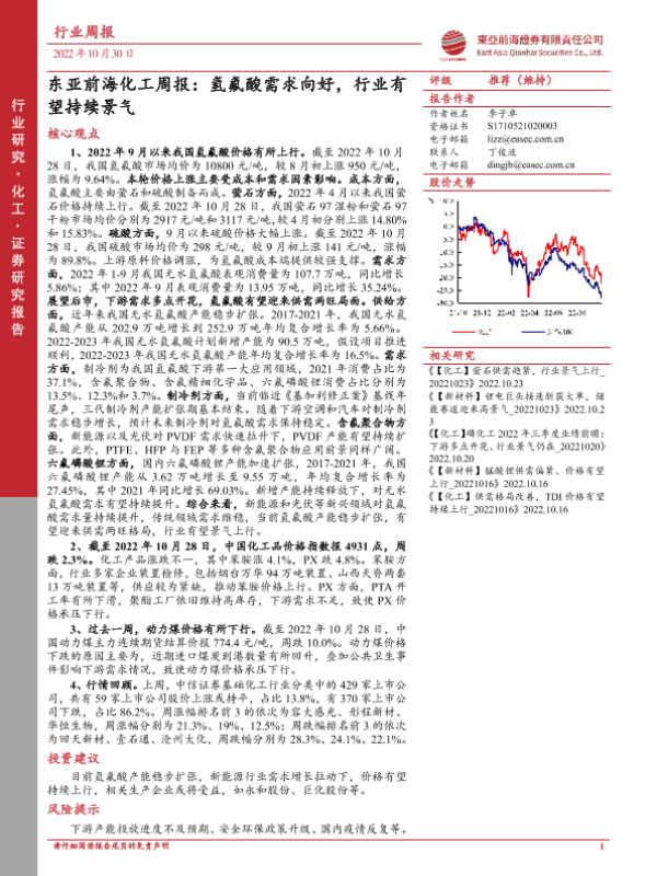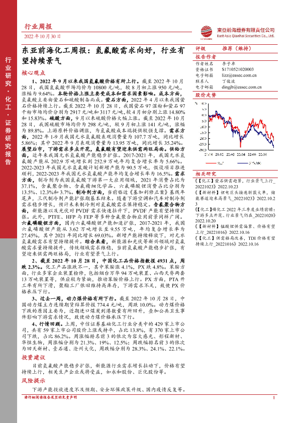 【东亚前海证券】【20221030】东亚前海化工周报:氢氟酸需求向好,行业有望持续景气-22页