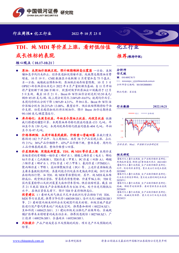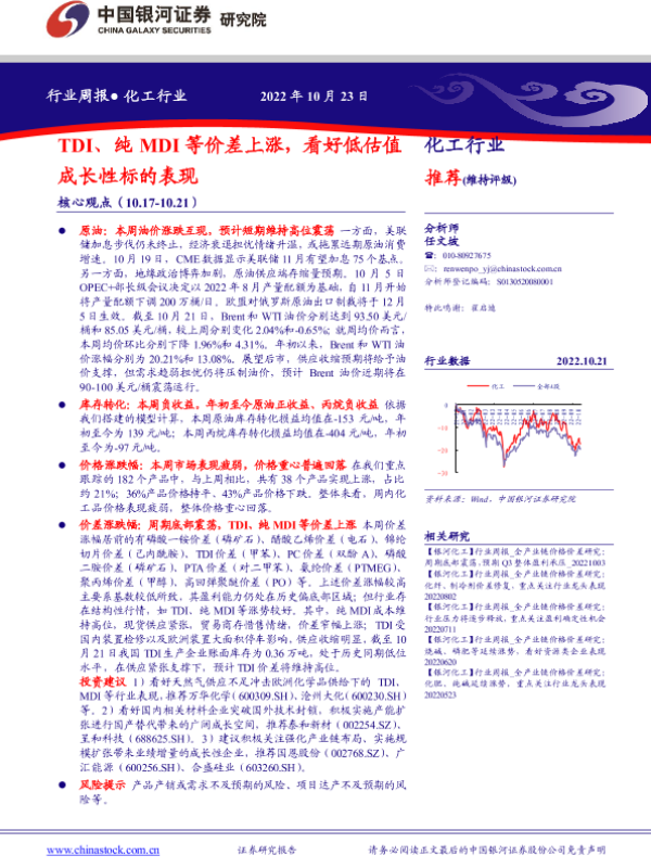【银河证券】【20221023】20221023-中国银河-化工行业周报:TDI、纯MDI等价差上涨,看好低估值成长性标的表现-18页
