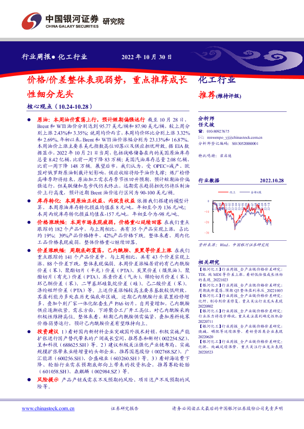 【银河证券】【20221030】20221030-中国银河-化工行业周报:价格 价差整体表现弱势,重点推荐成长性细分龙头-18页