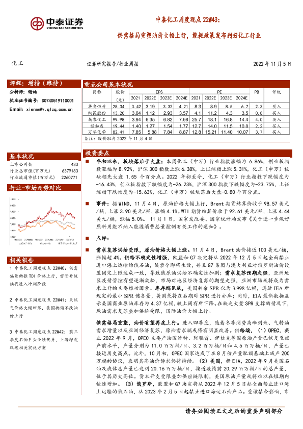 【中泰证券】【20221105】中泰化工周度观点22W43:供需格局重塑油价大幅上行,能耗政策发布利好化工行业-35页