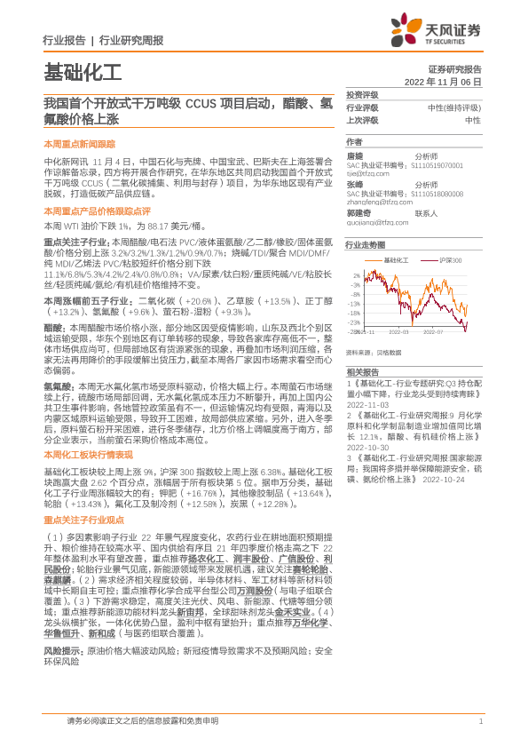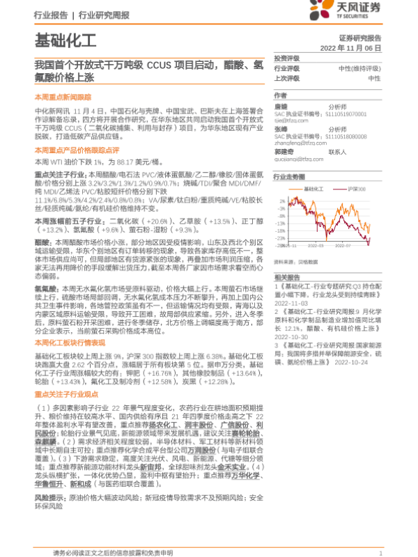 【天风证券】【20221106】20221106-天风证券-基础化工行业研究周报:我国首个开放式千万吨级CCUS项目启动,醋酸、氢氟酸价格上涨-20页