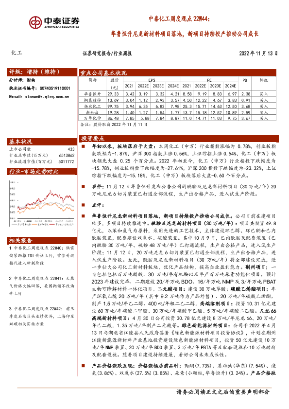 【中泰证券】【20221113】中泰化工周度观点22W44:华鲁恒升尼龙新材料项目落地,新项目持续投产推动公司成长-31页