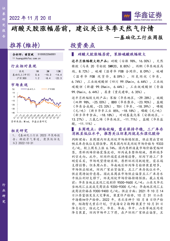 【华鑫证券】【20221120】20221120-华鑫证券-基础化工行业周报:硝酸天胶涨幅居前,建议关注冬季天然气行情-41页