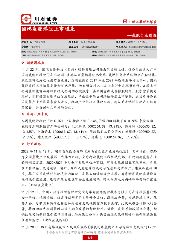 【川财证券】【20221125】20221125-川财证券-氢能行业周报:国鸿氢能港股上市递表-11页