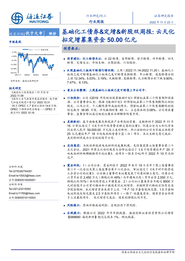 【海通证券】【20221123】基础化工债券&定增&新股双周报:云天化拟定增募集资金50.00亿元-19页