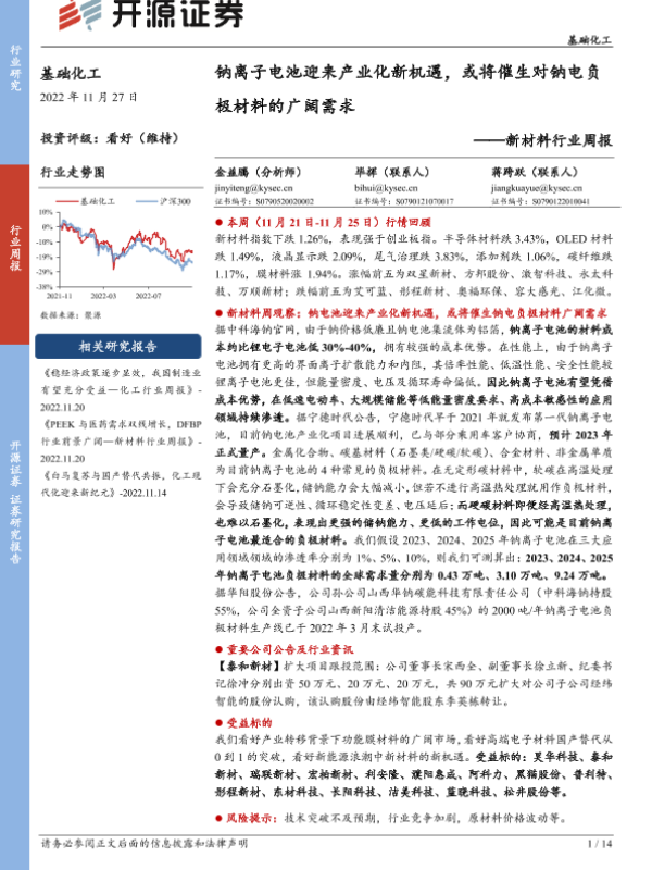 【开源证券】【20221127】新材料行业周报:钠离子电池迎来产业化新机遇,或将催生对钠电负极材料的广阔需求-14页