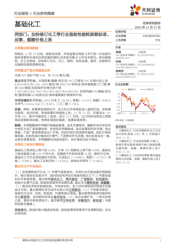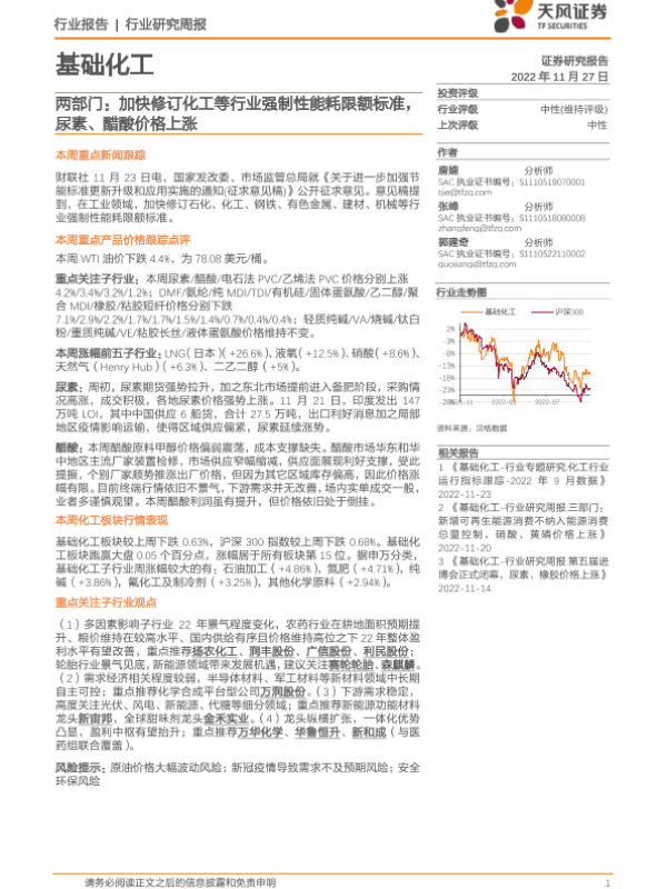 【天风证券】【20221127】基础化工行业研究周报:两部门:加快修订化工等行业强制性能耗限额标准,尿素、醋酸价格上涨-20页