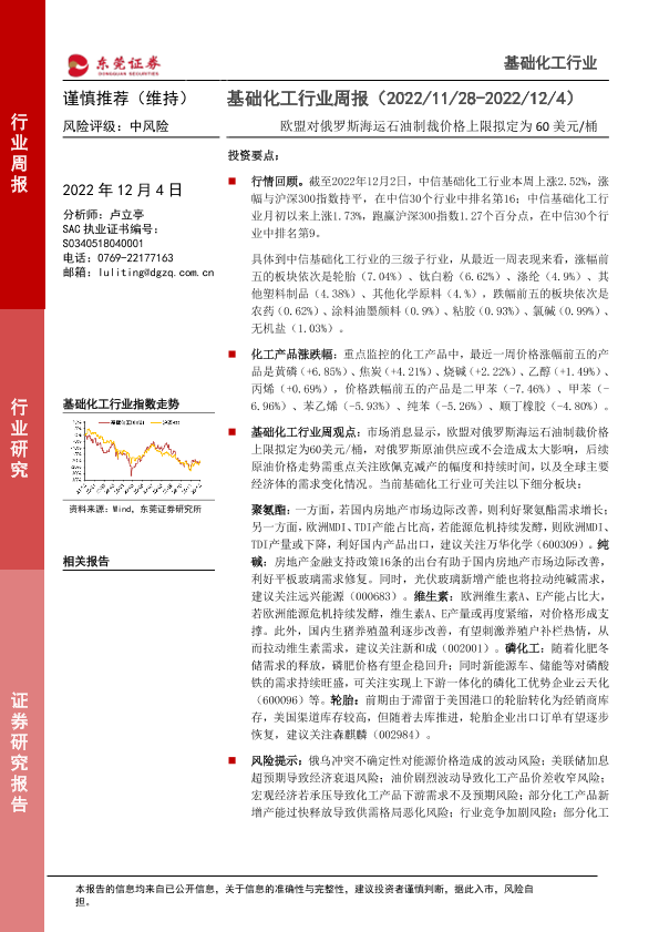 【东莞证券】【20221204】基础化工行业周报:欧盟对俄罗斯海运石油制裁价格上限拟定为60美元/桶-13页