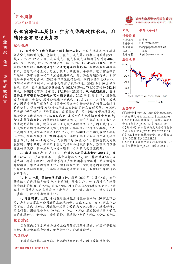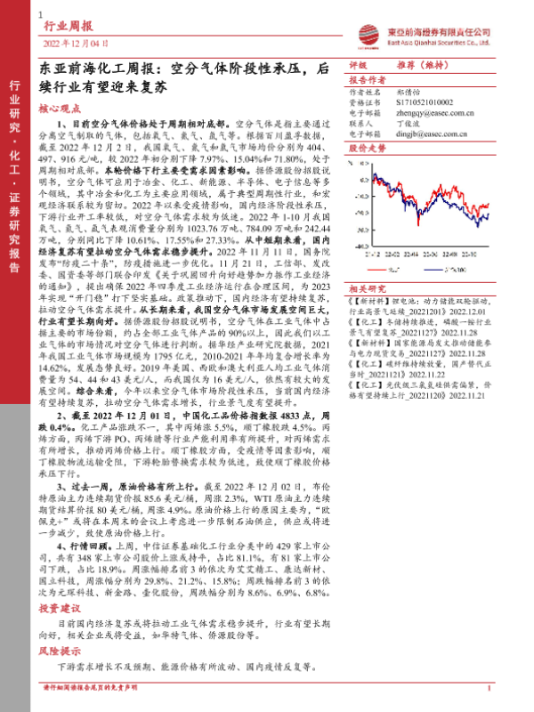【东亚前海证券】【20221204】20221204-东亚前海证券-化工周报:空分气体阶段性承压,后续行业有望迎来复苏-23页