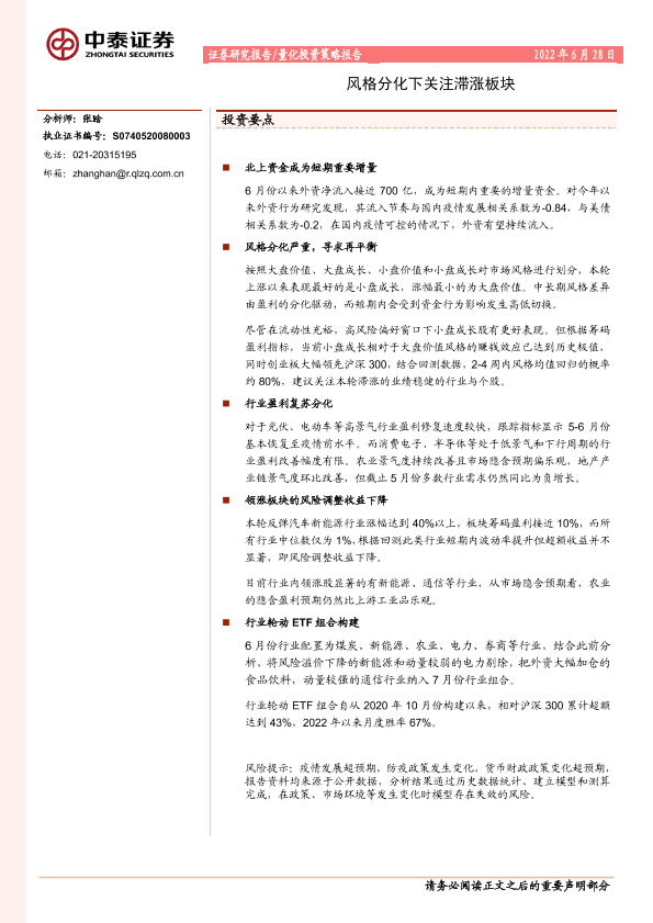 【中泰证券】【20220628】量化投资策略报告:风格分化下关注滞涨板块-20页