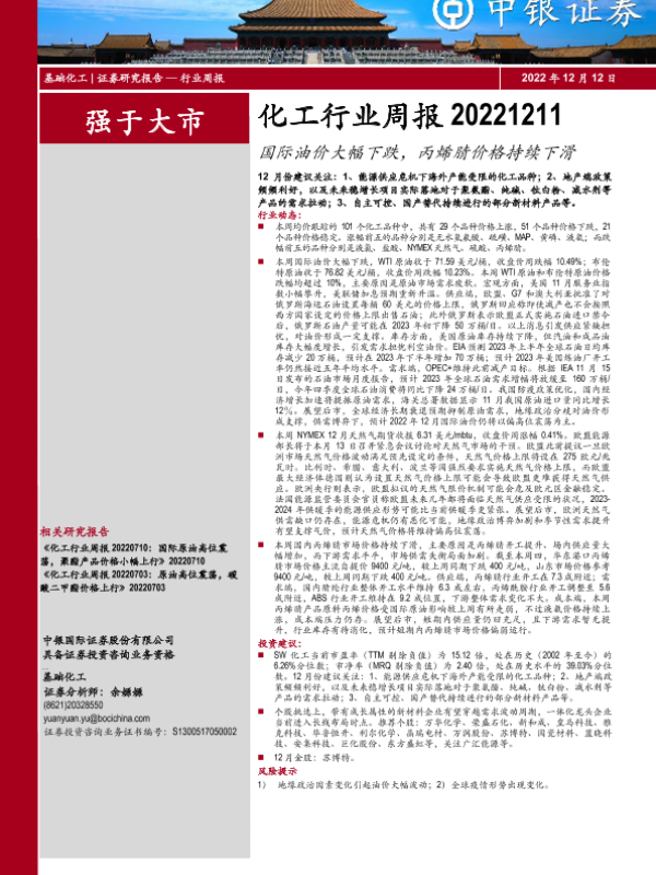 【中银证券】【20221212】20221212-中银证券-化工行业周报:国际油价大幅下跌,丙烯腈价格持续下滑-12页