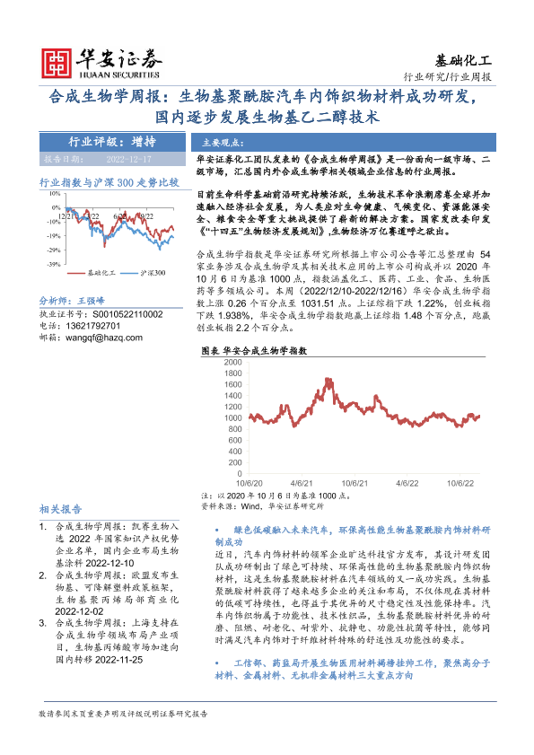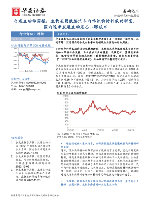 【华安证券】【20221217】合成生物学周报:生物基聚酰胺汽车内饰织物材料成功研发,国内逐步发展生物基乙二醇技术-26页