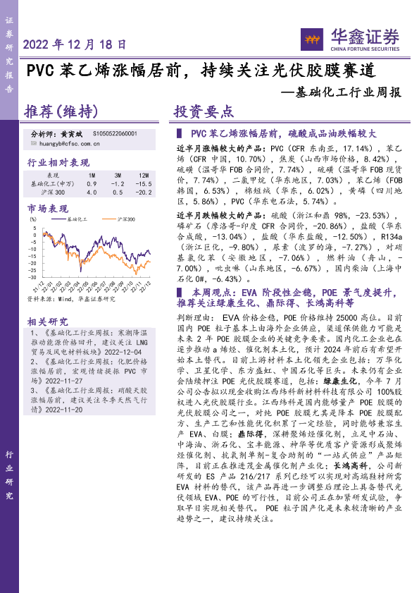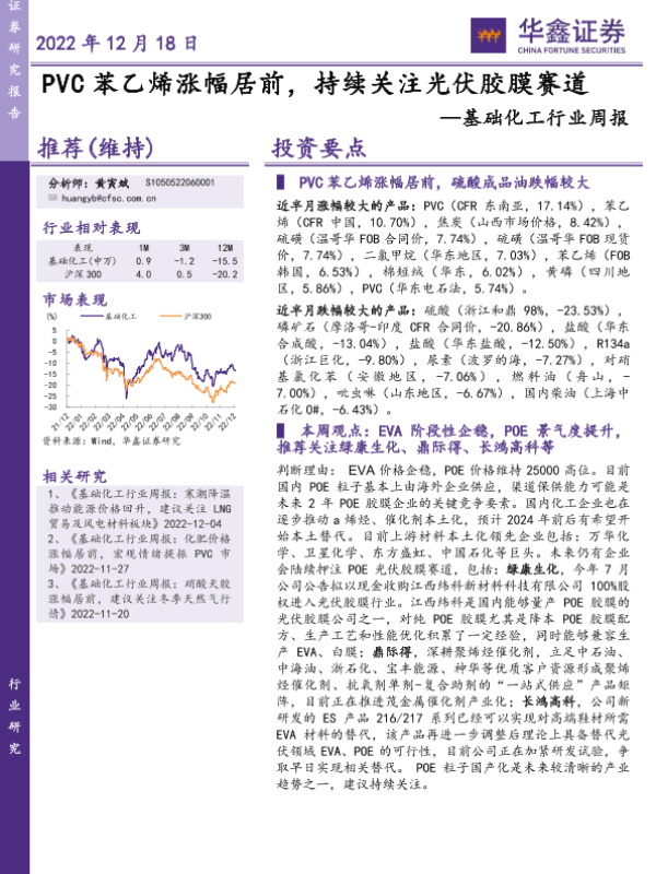 【华鑫证券】【20221218】基础化工行业周报:PVC苯乙烯涨幅居前,持续关注光伏胶膜赛道-39页