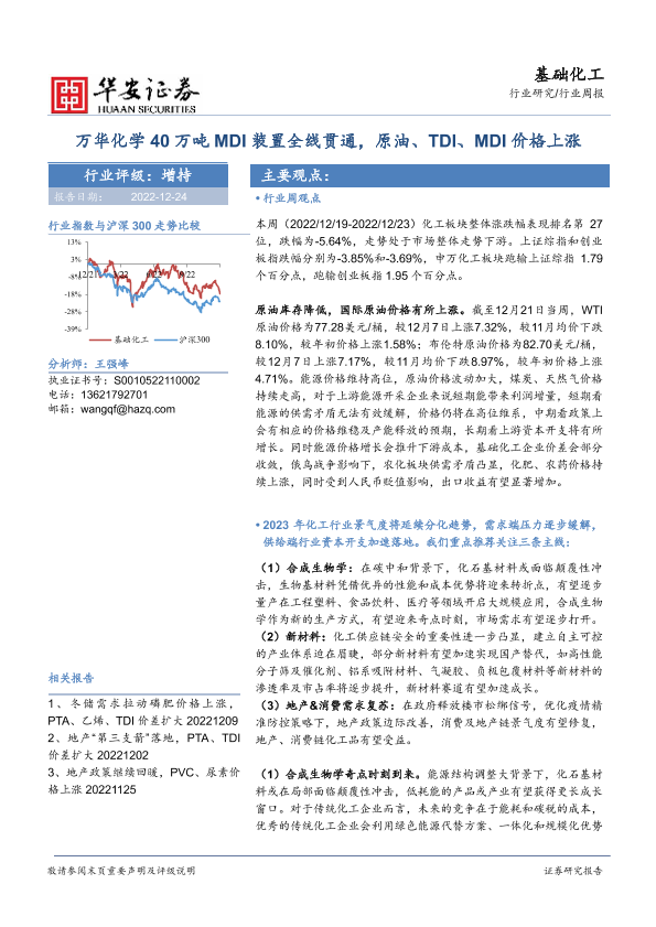 【华安证券】【20221224】20221224-华安证券-基础化工行业周报:万华化学40万吨MDI装置全线贯通,原油、TDI、MDI价格上涨-41页