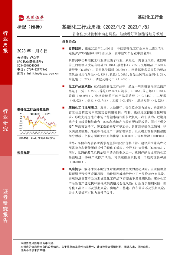 【东莞证券】【20230108】20230108-东莞证券-基础化工行业周报:首套住房贷款利率动态调整,继续看好聚氨酯等细分领域-12页
