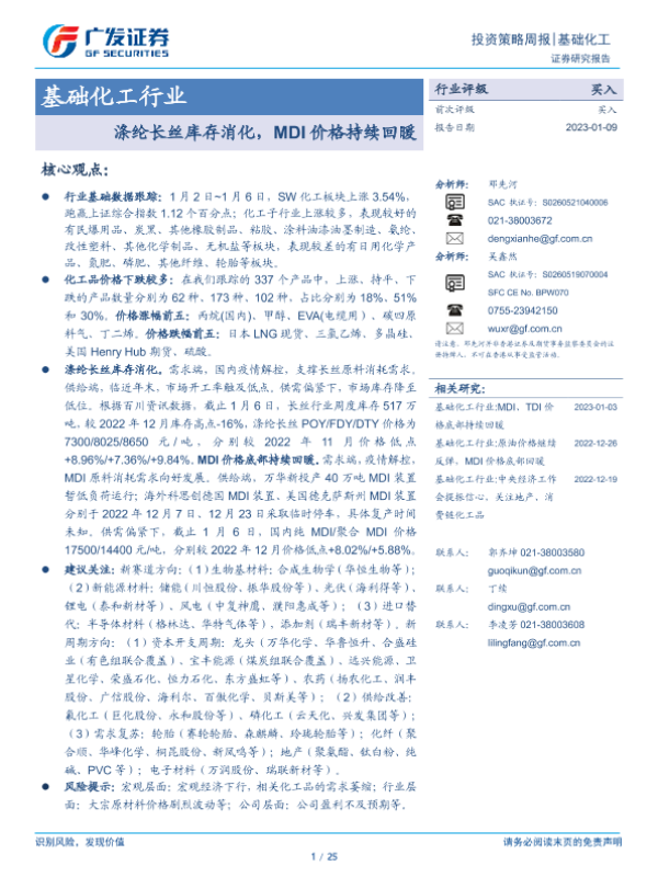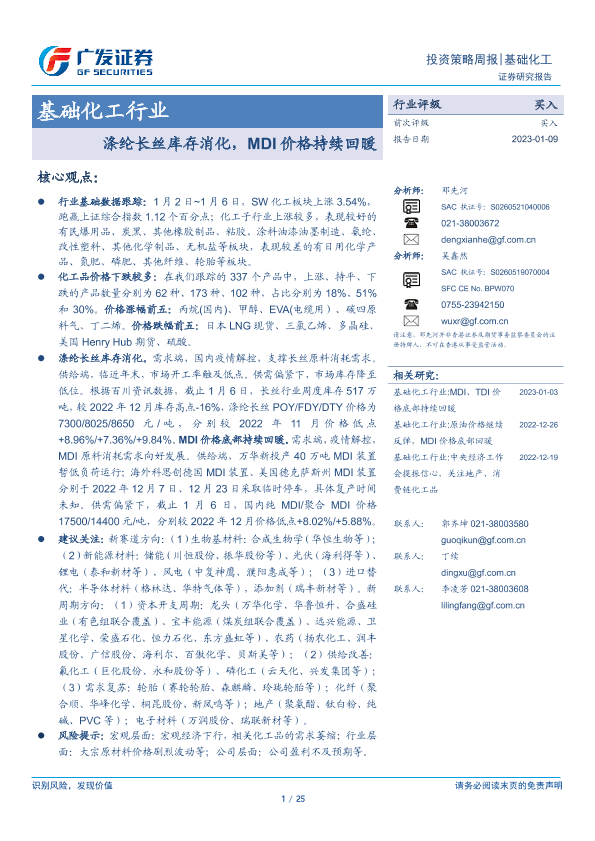 【广发证券】【20230109】基础化工行业:涤纶长丝库存消化,MDI价格持续回暖-25页