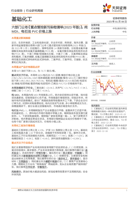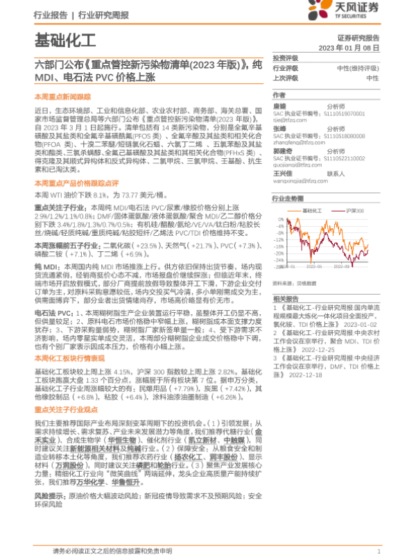 【天风证券】【20230108】基础化工行业研究周报:六部门公布《重点管控新污染物清单(2023年版)》,纯MDI、电石法PVC价格上涨-20页