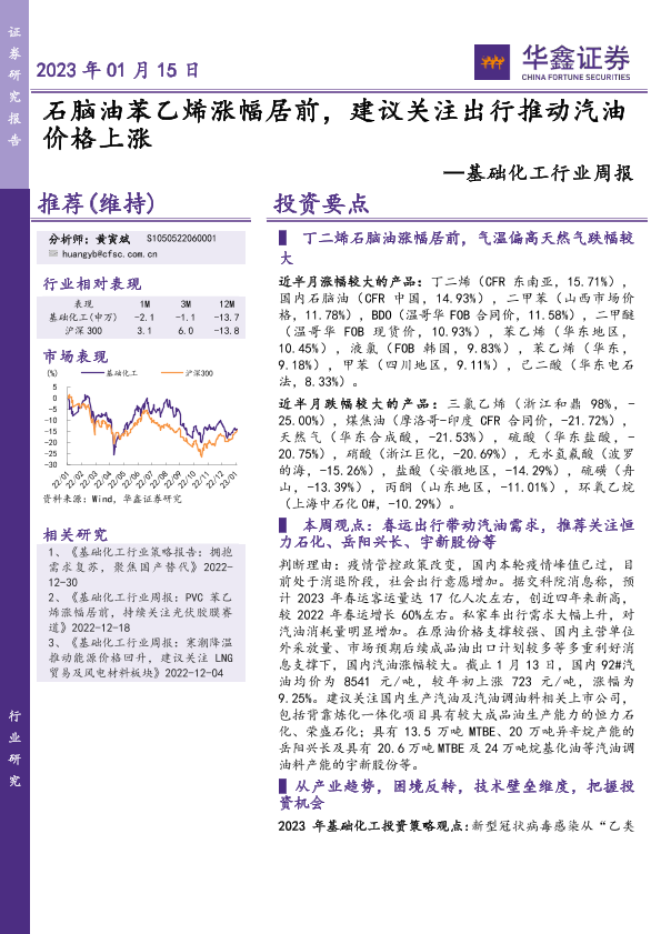 【华鑫证券】【20230115】20230115-华鑫证券-基础化工行业周报:石脑油苯乙烯涨幅居前,建议关注出行推动汽油价格上涨-40页