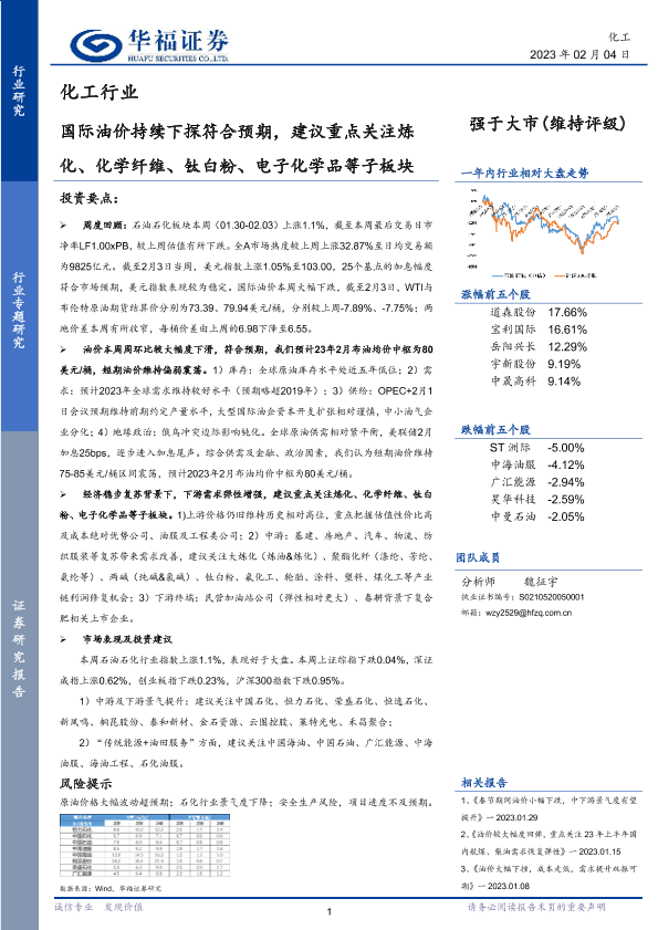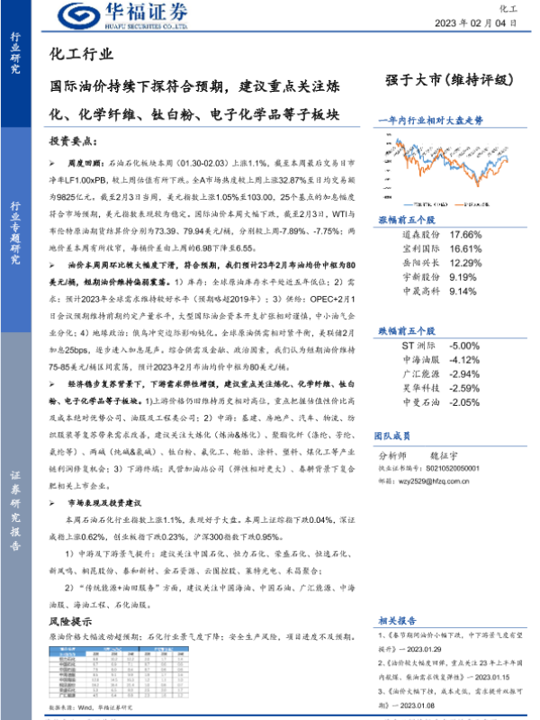 【华福证券】【20230204】20230204-华福证券-化工行业:国际油价持续下探符合预期,建议重点关注炼化、化学纤维、钛白粉、电子化学品等子板块-22页