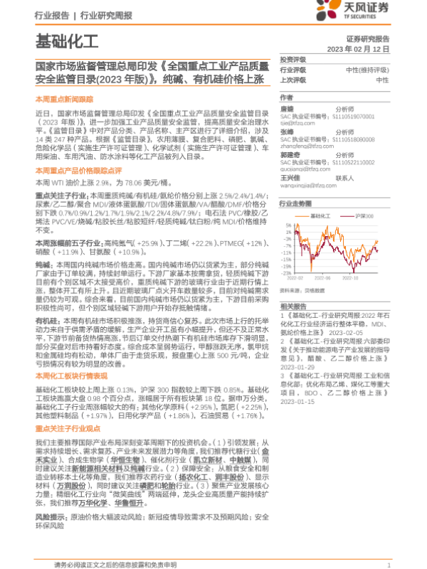 【天风证券】【20230212】基础化工行业研究周报:国家市场监督管理总局印发《全国重点工业产品质量安全监管目录(2023年版)》,纯碱、有机硅价格上涨-21页