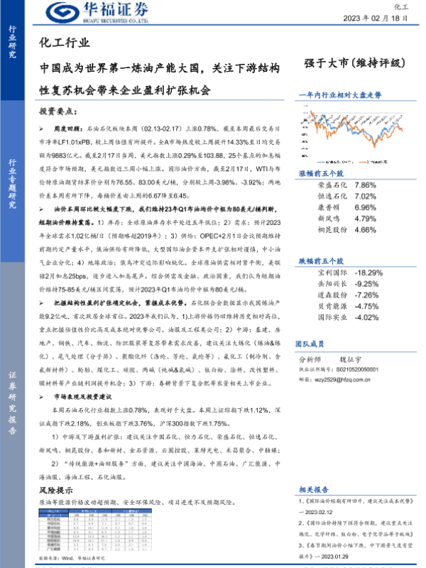 【华福证券】【20230218】20230218-华福证券-化工行业:中国成为世界第一炼油产能大国,关注下游结构性复苏机会带来企业盈利扩张机会-21页