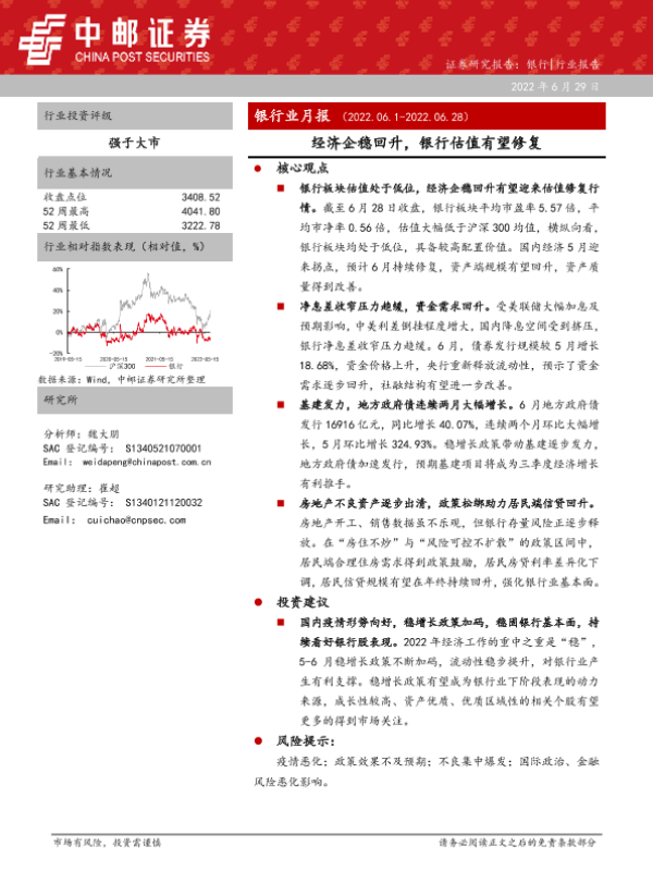 【中邮证券】【20220629】银行业月报:经济企稳回升,银行估值有望修复-23页