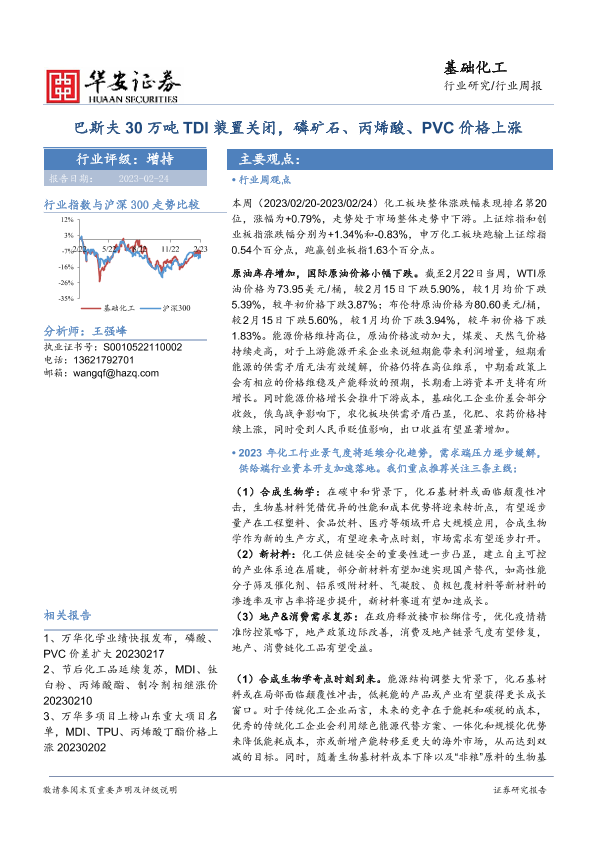 【华安证券】【20230224】20230224-华安证券-基础化工行业周报:巴斯夫30万吨TDI装置关闭,磷矿石、丙烯酸、PVC价格上涨-40页