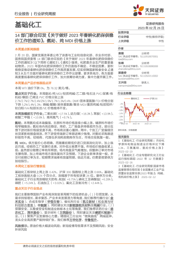【天风证券】【20230226】20230226-天风证券-基础化工行业研究周报:14部门联合印发《关于做好2023年春耕化肥保供稳价工作的通知》,氨纶、纯MDI价格上涨-21页