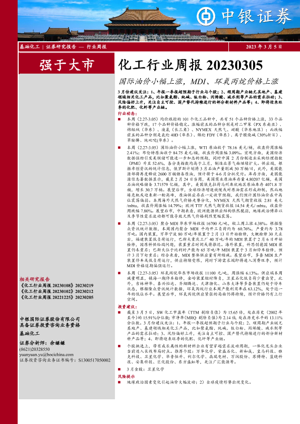 【中银证券】【20230305】20230305-中银证券-化工行业周报:国际油价小幅上涨,MDI、环氧丙烷价格上涨-15页