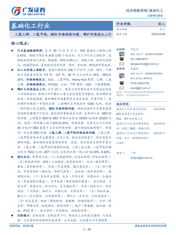 【广发证券】【20230306】20230306-广发证券-基础化工行业投资策略周报:三氯乙烯、二氯甲烷、MDI价格持续回暖,磷矿价格高位上行-19页