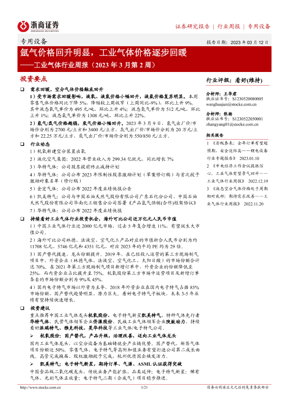 【浙商证券】【20230312】20230312-浙商证券-工业气体行业周报(2023年3月第2周):氩气价格回升明显,工业气体价格逐步回暖-21页