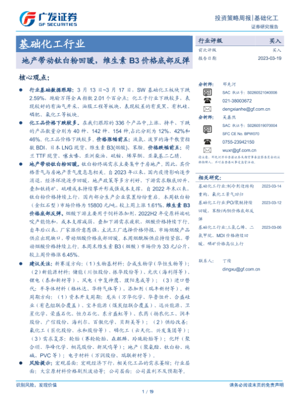 【广发证券】【20230319】20230319-广发证券-基础化工行业投资策略周报:地产带动钛白粉回暖,维生素B3价格底部反弹-19页