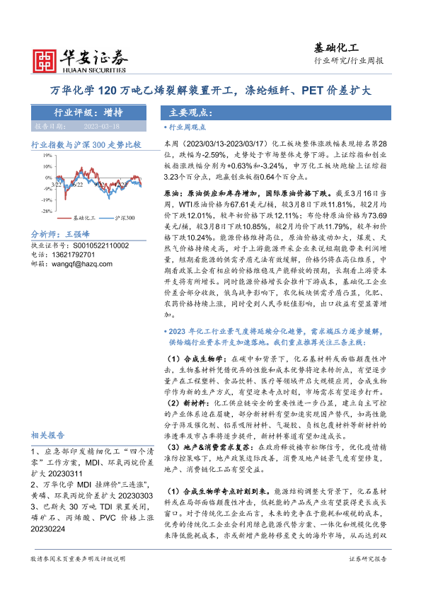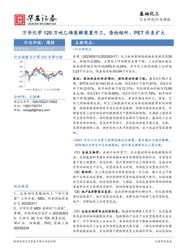 【华安证券】【20230318】20230318-华安证券-基础化工行业周报:万华化学120万吨乙烯裂解装置开工,涤纶短纤、PET价差扩大-42页