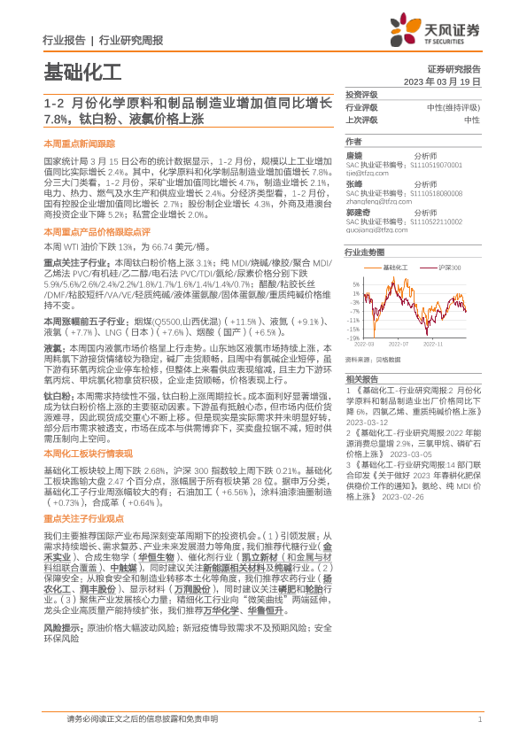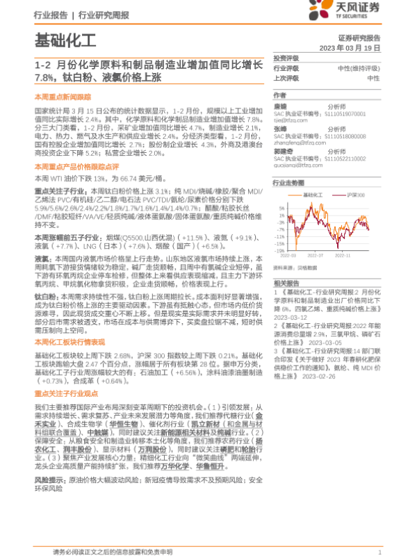 【天风证券】【20230319】基础化工行业研究周报:1-2月份化学原料和制品制造业增加值同比增长7.8%,钛白粉、液氯价格上涨-20页