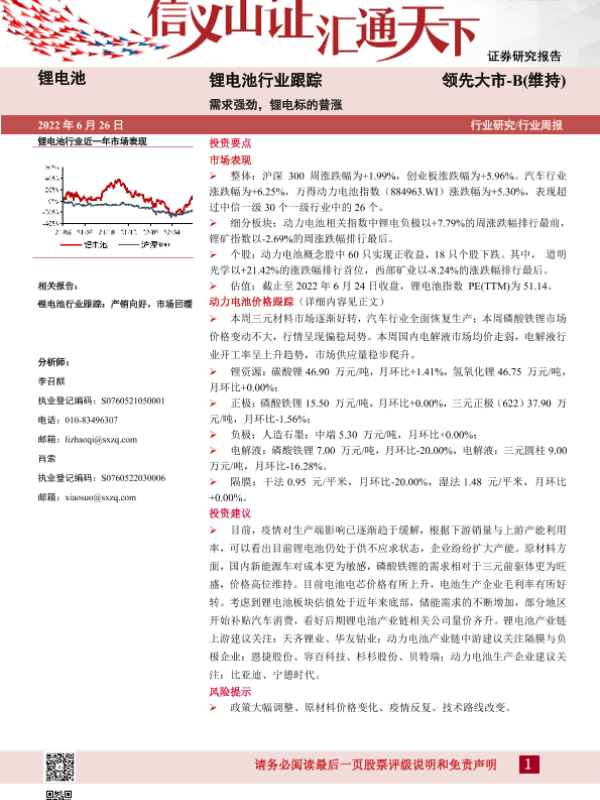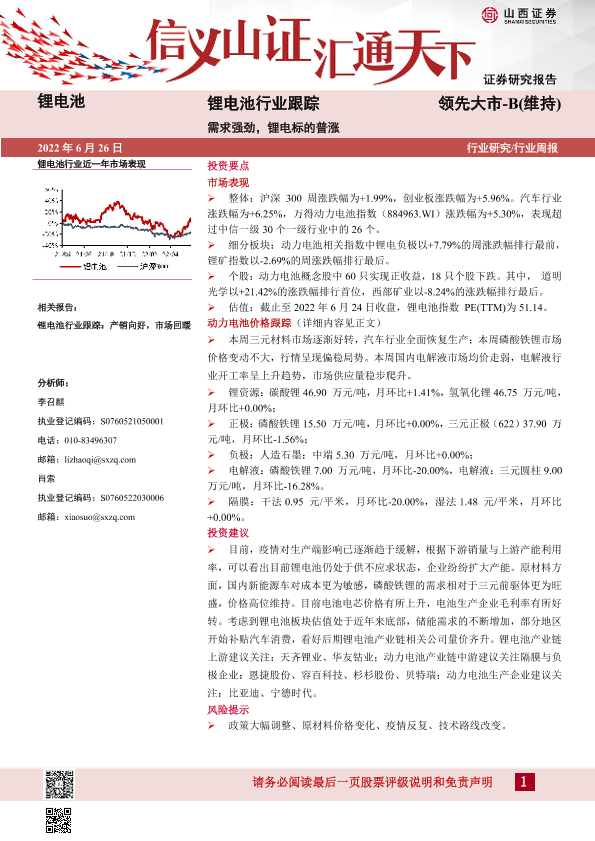 【山西证券】【20220626】锂电池行业跟踪:需求强劲,锂电标的普涨-18页