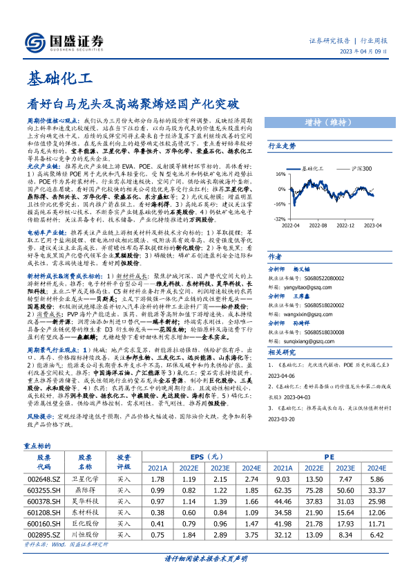 【国盛证券】【20230409】基础化工行业周报:看好白马龙头及高端聚烯烃国产化突破-22页