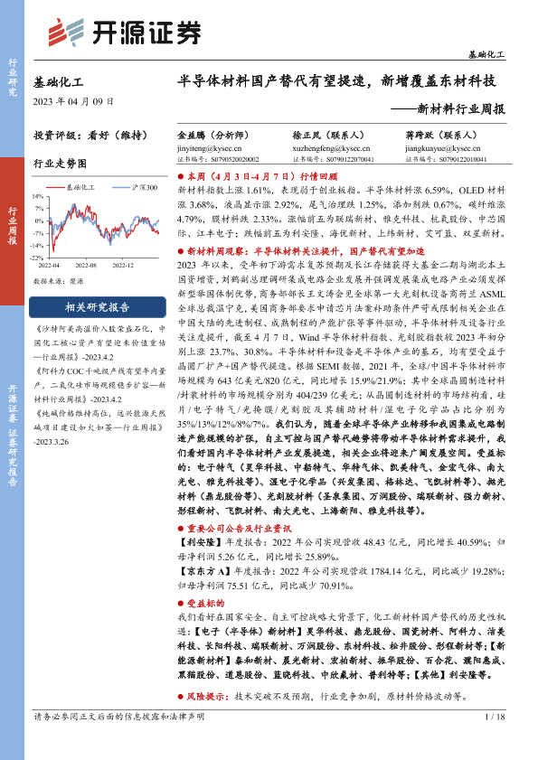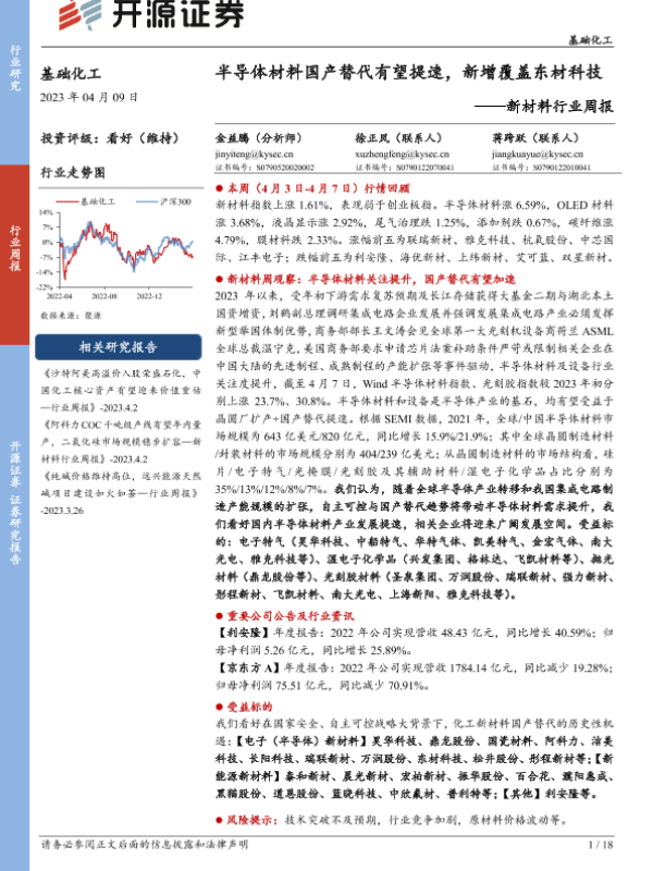 【开源证券】【20230409】20230409-开源证券-新材料行业周报:半导体材料国产替代有望提速,新增覆盖东材科技-18页