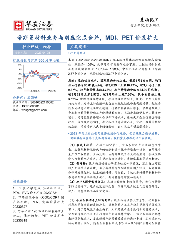 【华安证券】【20230408】20230408-华安证券-基础化工行业周报:帝斯曼材料业务与朗盛完成合并,MDI、PET价差扩大-44页
