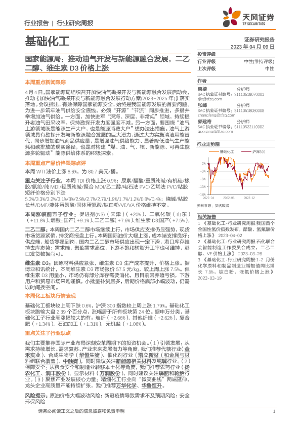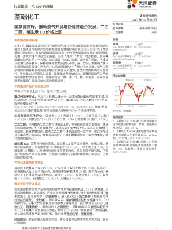 【天风证券】【20230409】20230409-天风证券-基础化工行业研究周报:国家能源局:推动油气开发与新能源融合发展,二乙二醇、维生素D3价格上涨-20页