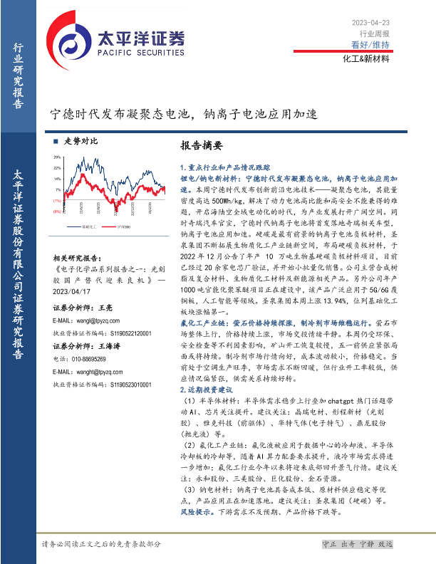 【太平洋证券】【20230423】20230423-太平洋-化工&新材料行业周报:宁德时代发布凝聚态电池,钠离子电池应用加速-29页