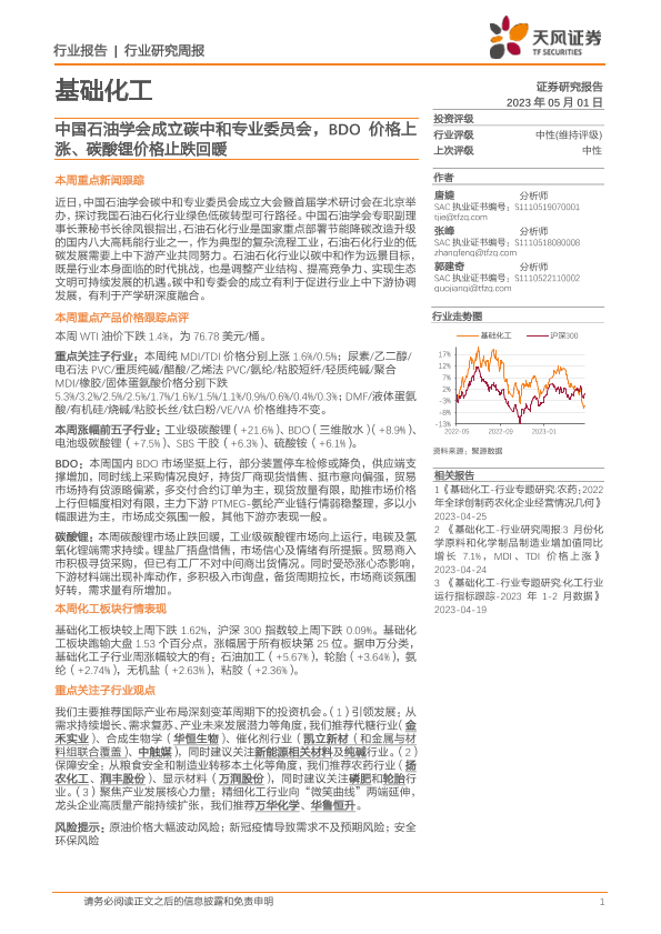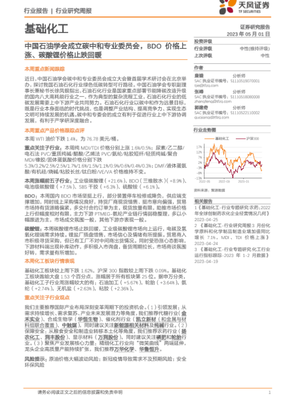 【天风证券】【20230501】20230501-天风证券-基础化工行业研究周报:中国石油学会成立碳中和专业委员会,BDO价格上涨、碳酸锂价格止跌回暖-20页
