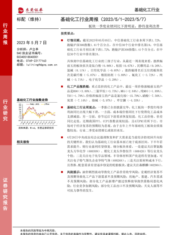 【东莞证券】【20230507】基础化工行业周报:板块一季度业绩同比下滑明显,静待盈利改善-12页